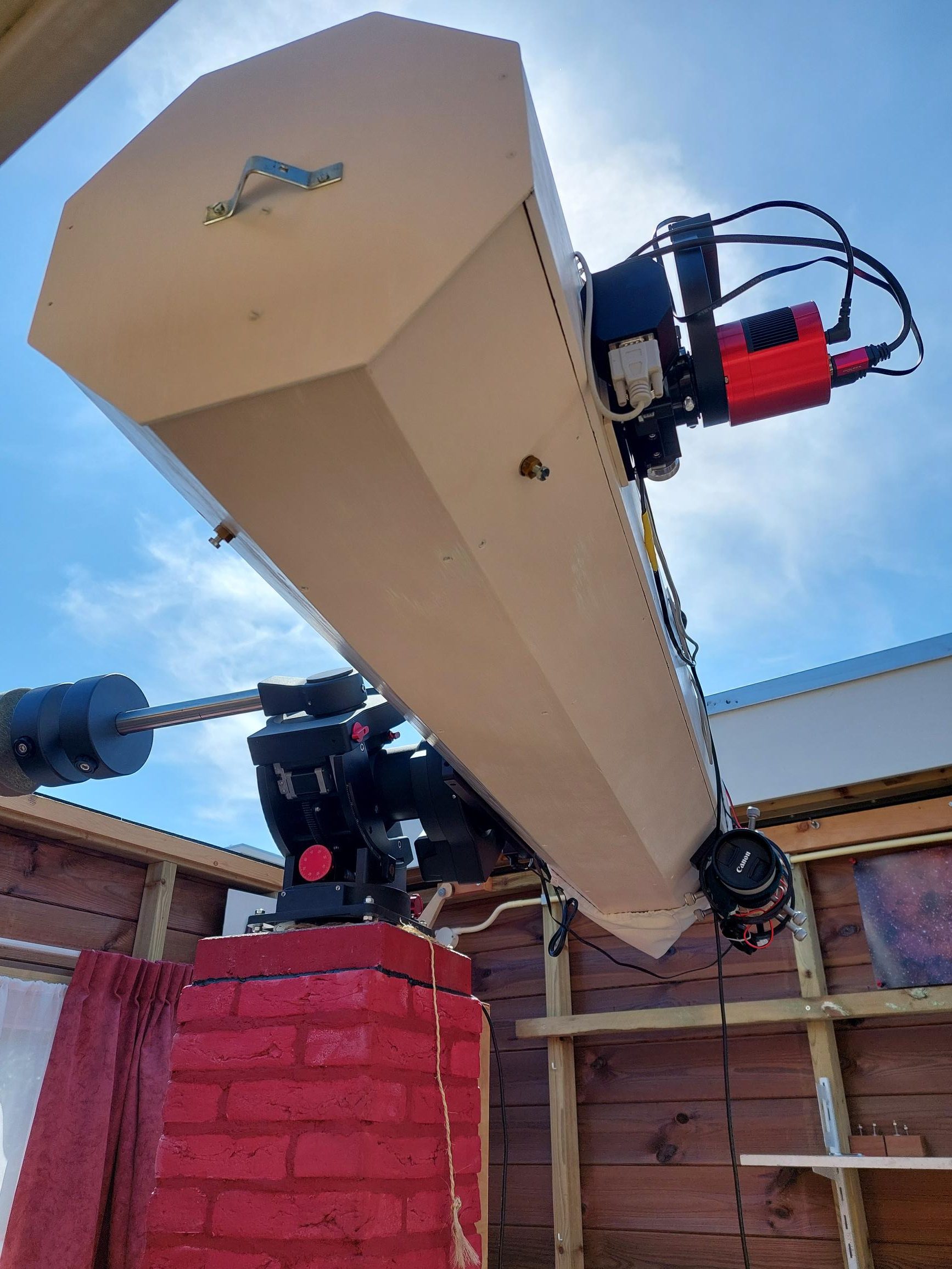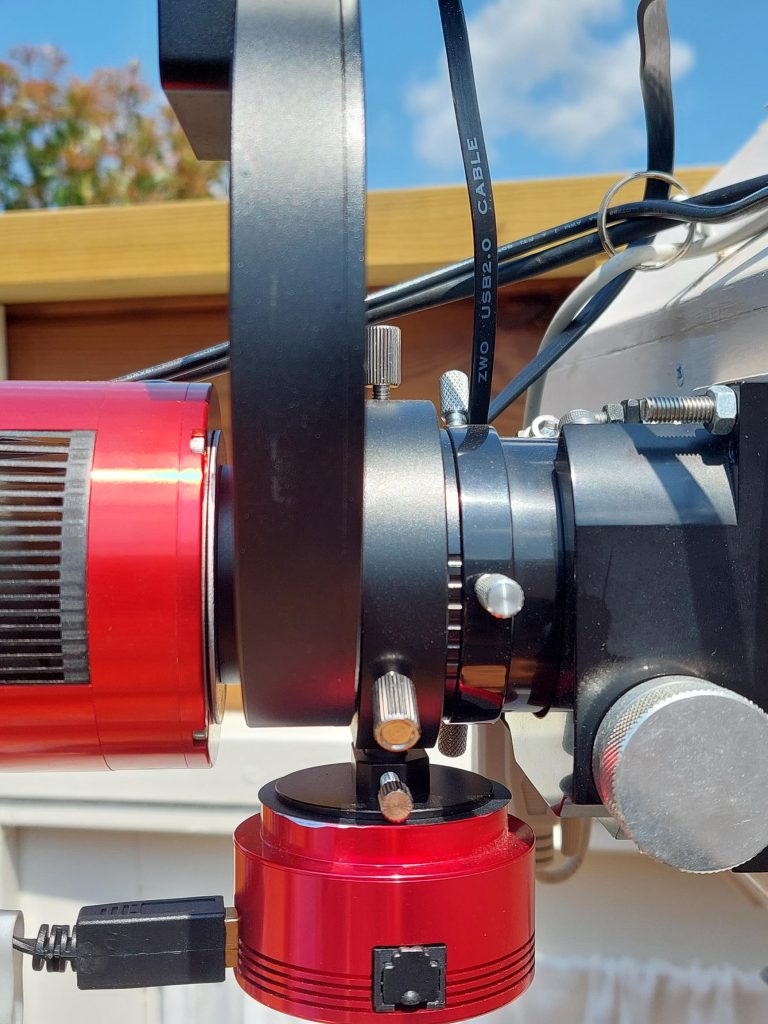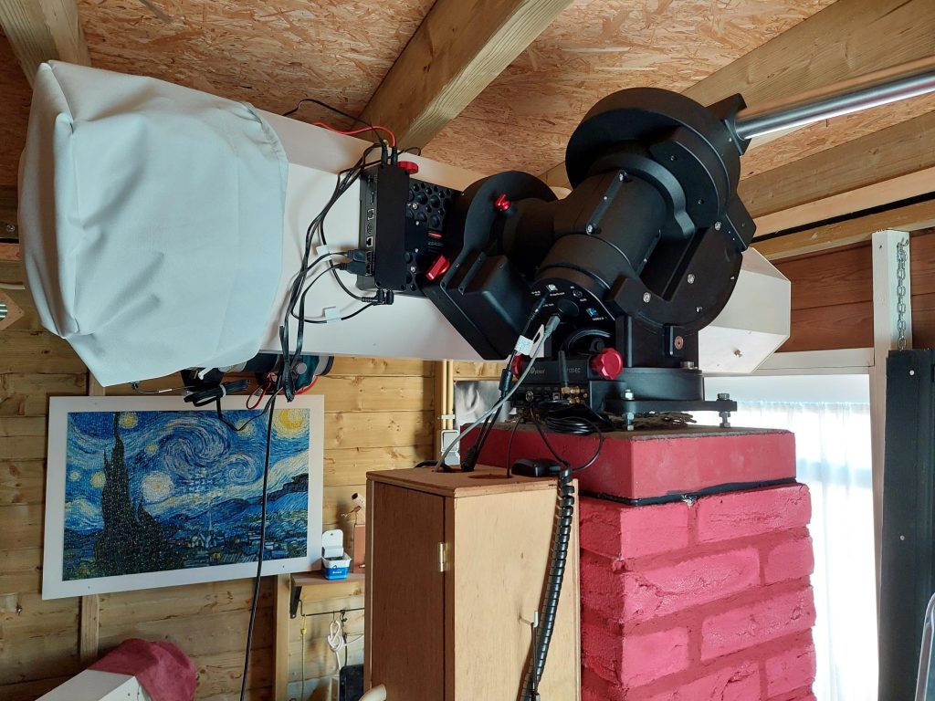ZWO ASI 1600MM Pro astrocamera with 7x 36mm Electronic filter wheel with L, R, G, B, Ha, Olll and Sll filters. Since April 2023 the telescope is equipped with a TS-CPU coma corrector and an Off Axis Guider.
